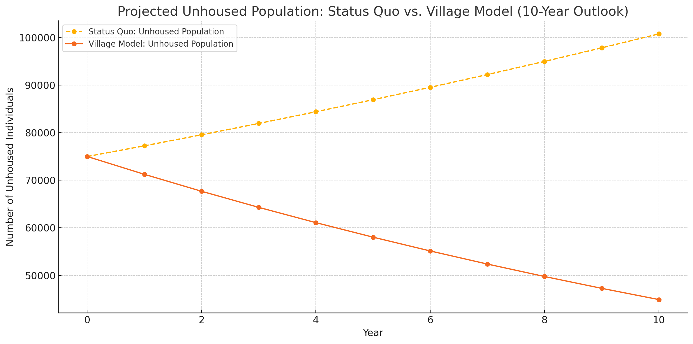Hereâs a visual chart showing how our Village model steadily reduces the unhoused population over the next 10 yearsâwhile the status quo leads to rising numbers year after year.