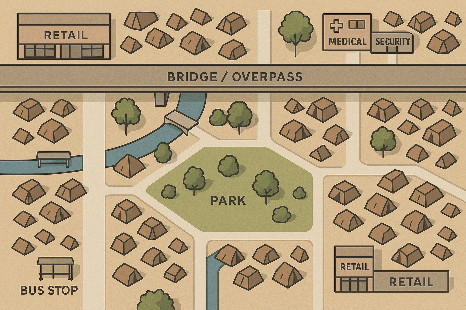 Zone B – Skid Row–Style Open Habitat A protected, street-like environment designed to resemble the areas where many unhoused individuals feel most comfortable. Includes tents, fake storefront facades, benches, and overpasses—recreated in a safe, monitored setting. No pressure. No judgment. Just space to exist and breathe. Basically designed to resemble Skid Row, but with safety, medical patrols, harm-reduction points, and peer oversight. Places where insane unhoused people can sleep, yell, wander, and just be, but without risk of getting hit by cars, hurt by dealers, or caught in street sweeps. | ![]() |