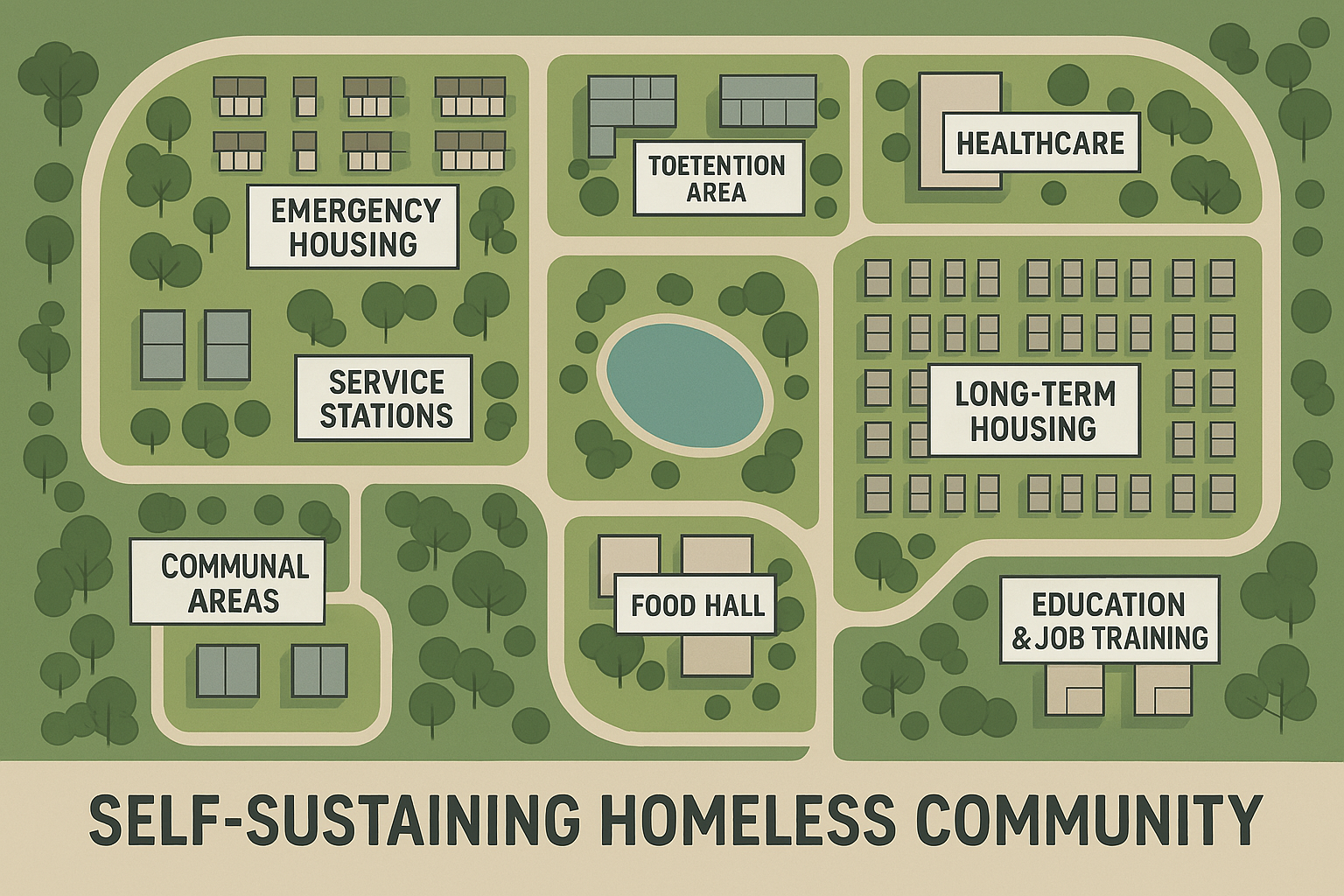 Zone A – Structured Core Campus The heart of LoonieLand™. Includes dormitories, peer-run kitchens, health clinics, community gardens, and job training stations. It is where transition becomes transformation—without being forced. This is where semi-sane to sane unhoused people live, train, manage, and operate the system. This is where the staff resides, where planning happens, where healing can begin. | ![]() |