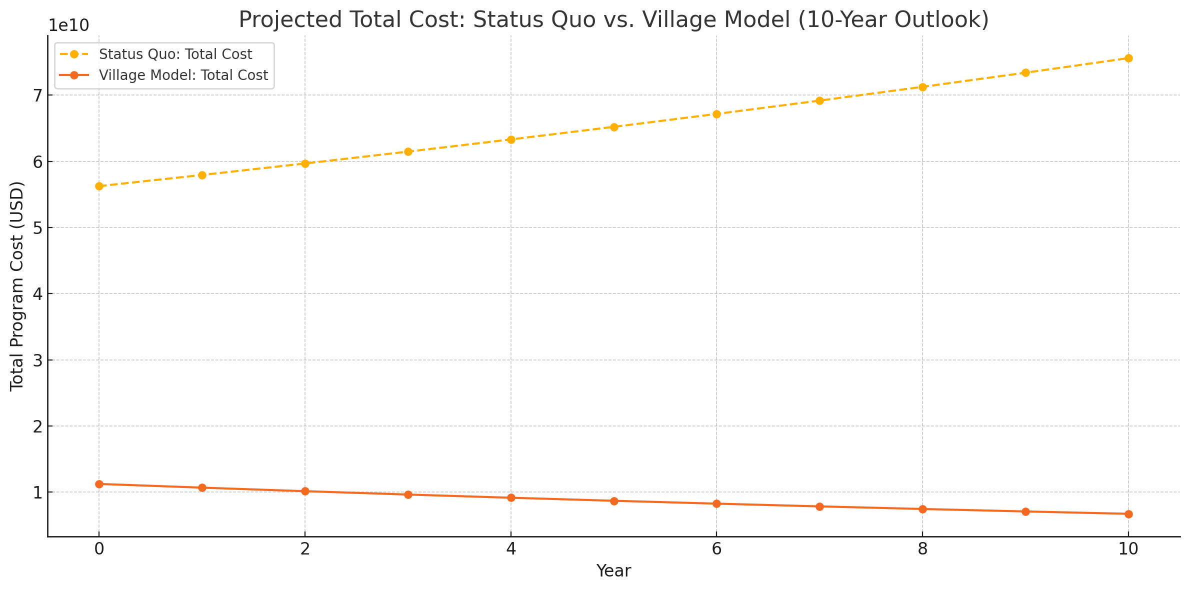 Hereâs the cost savings chart: it clearly shows how our Village model saves hundreds of millions of dollars over time compared to the status quo. Not only are we helping more peopleâweâre doing it more responsibly.