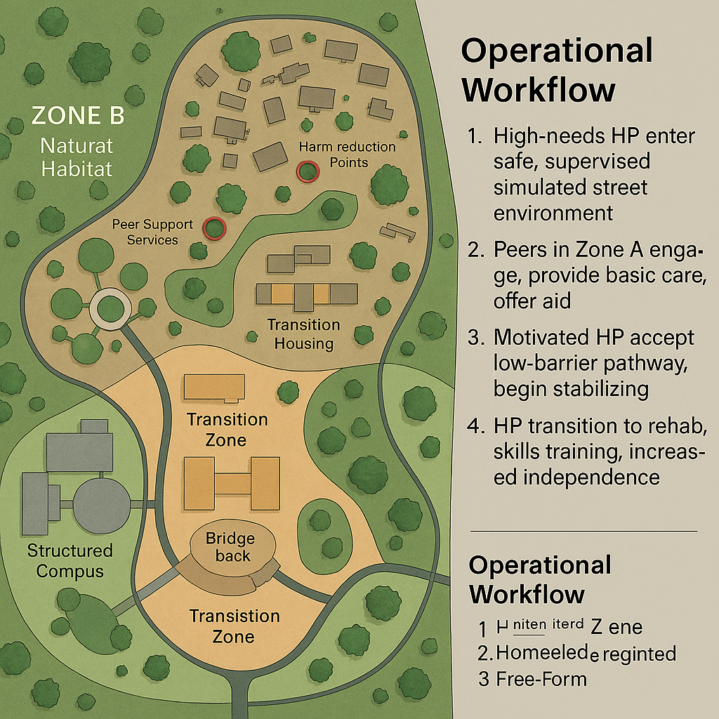We can link Zone A (Structured Core) and Zone B (Natural Habitat) with Transition Zones — soft pathways where people naturally shift between chaos and structure. “Peer Navigators” from Zone A who roam Zone B, offering food, basic medical aid, clean clothes, and non-pushy conversation. A "Bridgeback Café" or neutral chill zone—no rules, no pressure, just coffee and clean space, as a low-barrier bridge from B to A.🛑 Freedom with Boundaries